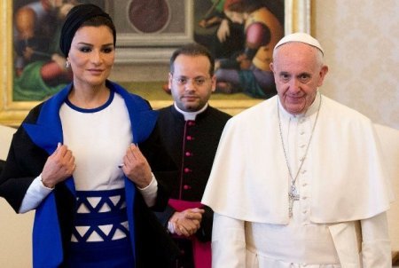 Məsələn, bu fotoda Moza Papa Fransisklə bir yerdədir. Belə bir mənzərəni başqa bir ərəb şeyxinin həyat yoldaşı ilə təsəvvür etmək sadəcə mümkün deyil.