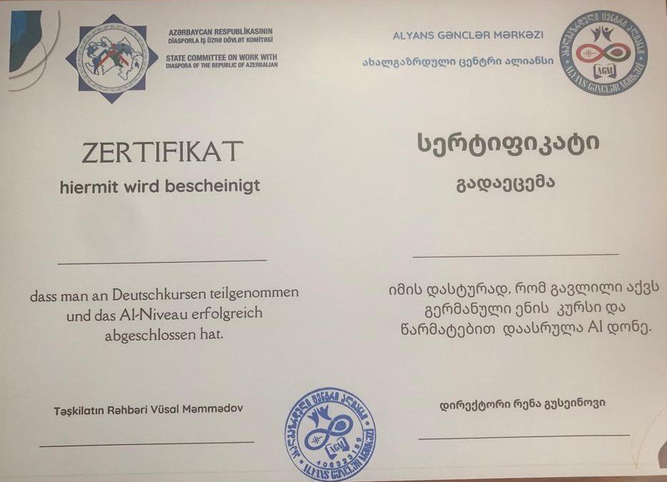 Qeyd edək ki, Diasporla İş üzrə Dövlət Komitəsinin dəstəyi ilə fəaliyyət göstərən mərkəzin nəzdindəki kurslar azərbaycanlı uşaqlar üçün tamamilə ödənişsizdir. Bu, Komitənin qonşu ölkədə həyata keçirdiyi ən vacib layihələrindən biridir. Kursların sonunda müdavimlərə sertifikatlar təqdim edilir. Məhz bu kursların fəaliyyəti sayəsində azərbaycanlı gənclər Gürcüstanın müxtəlif ali məktəblərinə qəbul olunmaq üçün lazımi biliklər əldə etmək imkanı qazanırlar.