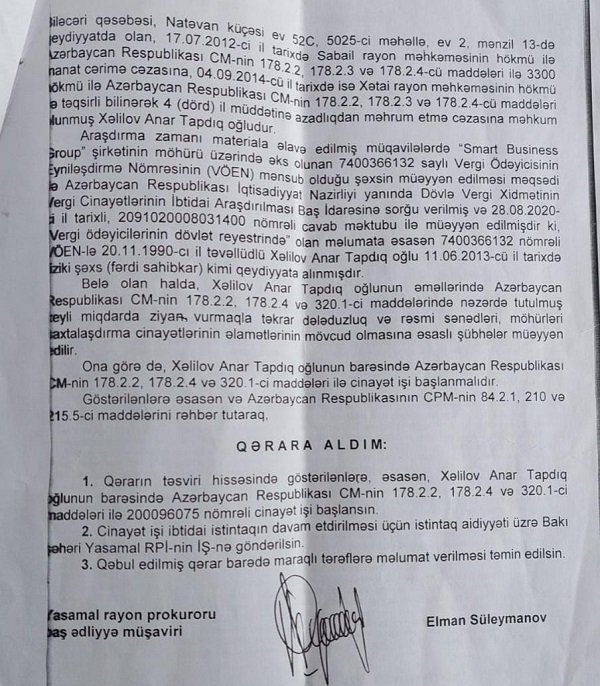 Yasamal rayon polis bölməsinin keçirdiyi əməliyyat nəticəsində Azər Əliyevin əslində hələ 2014-cü ildə Cinayət Məcəlləsinin 178.2.2, 178 2.3 maddələri ilə təqsirli bilinib 4 il müddətinə həbs cəzası almış Anar Xəlilov olduğu müəyyən edilib. O, yenidən dələduzluq, rəsmi sənədləri və möhürləri saxtalaşdırma maddələri ilə şübhəli bilinib və barəsində cinayət işi başlanılıb.