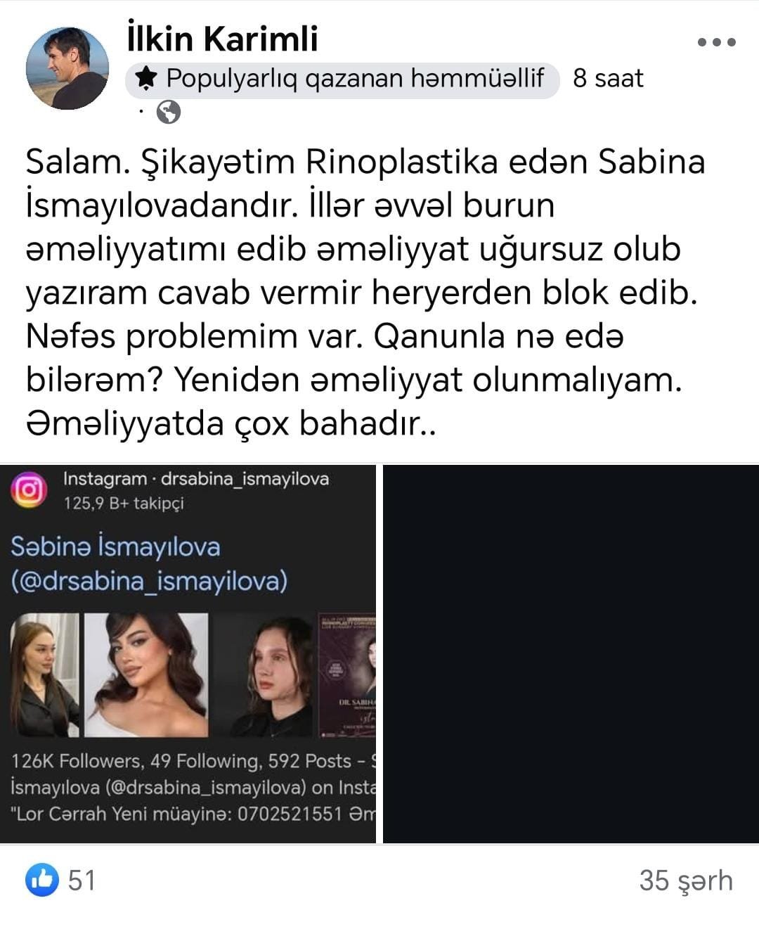 Plastik cərrah Səbinə İsmayılovanın əməliyyat etdiyi bir neçə xəstə ondan narazıdır. Pasiyentlər bununla bağlı Feysbuk sosial şəbəkəsində başlarına gələni yazıblar.Bir neçə il əvvəl S.İsmayılovanın burun əməliyyatı etdiyi İlkin Kərimli həkimdən şikayətçidir. O bu barədə həkimə bildirsə də, heç bir nəticəsi olmayıb: