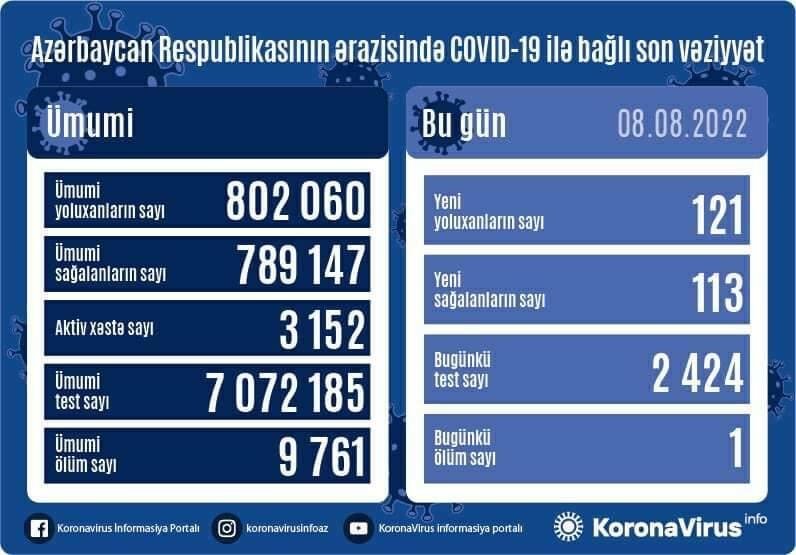 Azərbaycan Respublikasında koronavirus (COVID-19) infeksiyasına 121 yeni yoluxma faktı qeydə alınıb, 113 nəfər müalicə olunaraq sağalıb.Nazirlər Kabineti yanında Operativ Qərargahdan