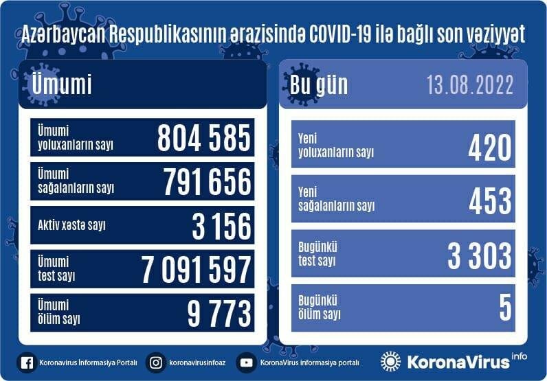 Azərbaycanda son sutkada koronavirus infeksiyasına 420 yeni yoluxma faktı qeydə alınıb, 453 nəfər müalicə olunaraq sağalıb və evə buraxılıb.bakunews.tv milli.az-a istinadən xəbər verir ki, bu barədə Nazirlər Kabineti yanında Operativ Qərargah məlumat yayıb.
