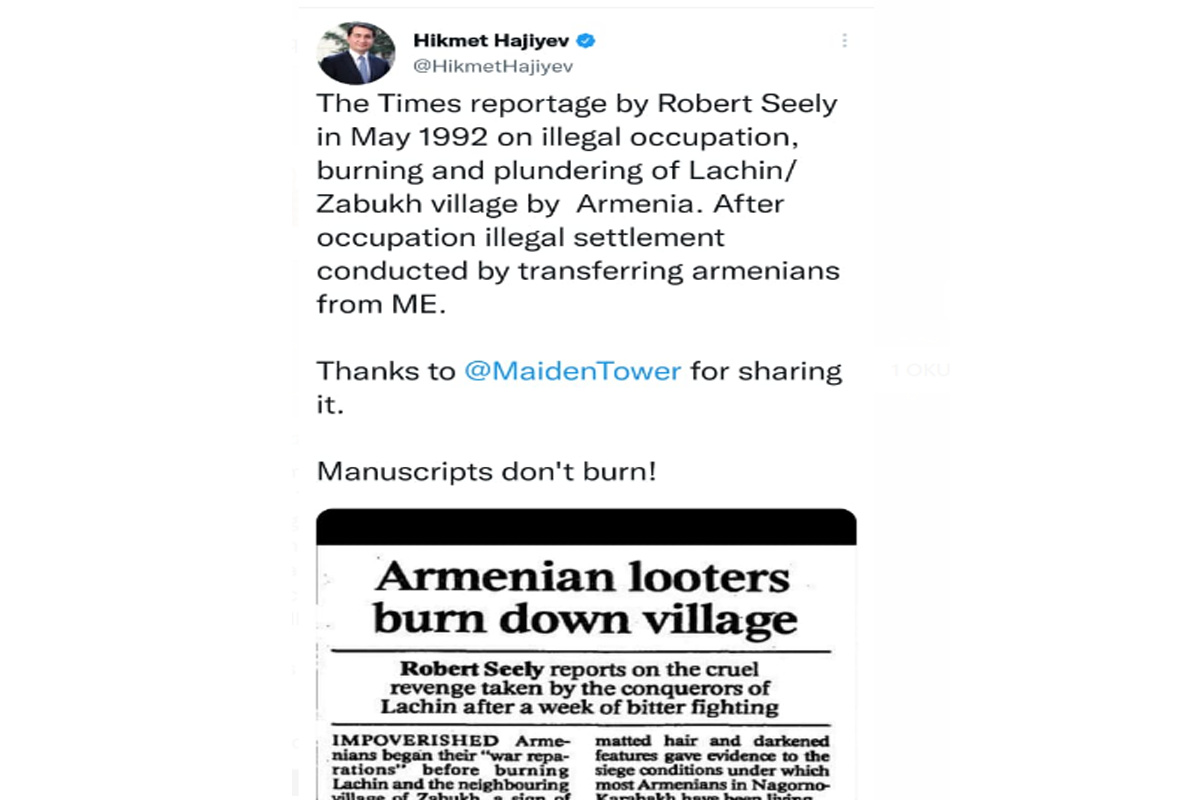 "Ermənistan tərəfindən 1992-ci ildə Laçının Zabux kəndinin qanunsuz işğalı, yandırılması və yağmalanması ilə bağlı Robert Siilinin "The Times" reportajı. İşğaldan sonra Yaxın Şərqdən olan ermənilərin qanunsuz məskunlaşdırılması aparıldı. Əlyazmalar yanmır", - Prezidentin köməkçisi vurğulayıb.