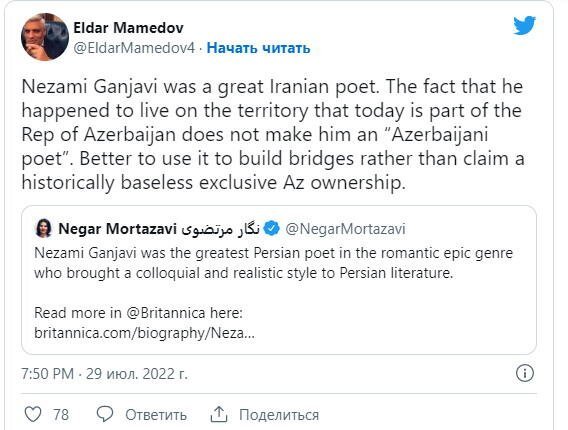 Məsələn, İsrailin Azərbaycandakı səfiri Corc Dikin Təbrizlə bağlı sosial şəbəkələrdəki məşhur fləşmobuna cavab olaraq E.Məmmədov dahi şairimiz Nizami Gəncəvinin "fars mənşəyi" barədə Twitter-dəki akkauntunda paylaşım etmişdi.