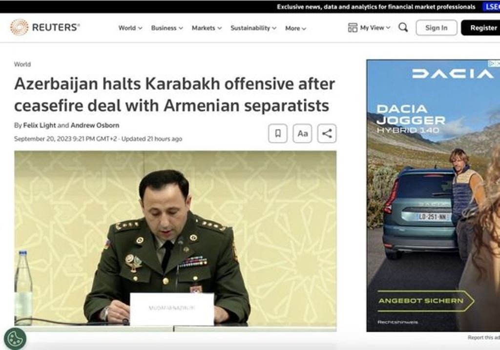 “Reuters” agentliyində yayımlanan məqalədə Azərbaycanın həyata keçirdiyi uğurlu antiterror tədbirlərinin erməni separatçı qüvvələrini təslim olmağa məcbur etdiyini və bundan sonra tədbirlərin dayandırıldığı qeyd edilib. Məqalədə Azərbaycan Prezidenti İlham Əliyevin xalqa müraciətinə də yer verilib və dövlətimizin başçısının fikirlərindən iqtibas gətirilərək, təxminən 24 saat davam edən tədbirlərdən sonra Azərbaycanın “dəmir yumruq”la suverenliyini bərpa etdiyi diqqətə çatdırılıb. Eyni zamanda, Ermənistan ordusunun qalıqlarının Azərbaycan ərazilərindən çıxarılacağı və Qarabağda yaşayan ermənilərin Azərbaycan cəmiyyətinə inteqrasiyasına başlanacağı da qeyd olunub.