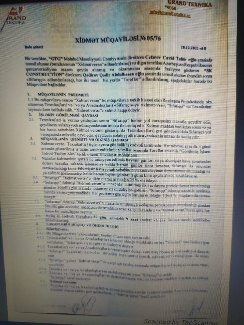 “SC CONSTRUCTİON” MMC arasınada 01 yanvar 2022-ci il tarixdə XQL-2021-041 nömrəli müqavilə imzalanmışdır. 2021-ci ilin dekabr ayı tarixində