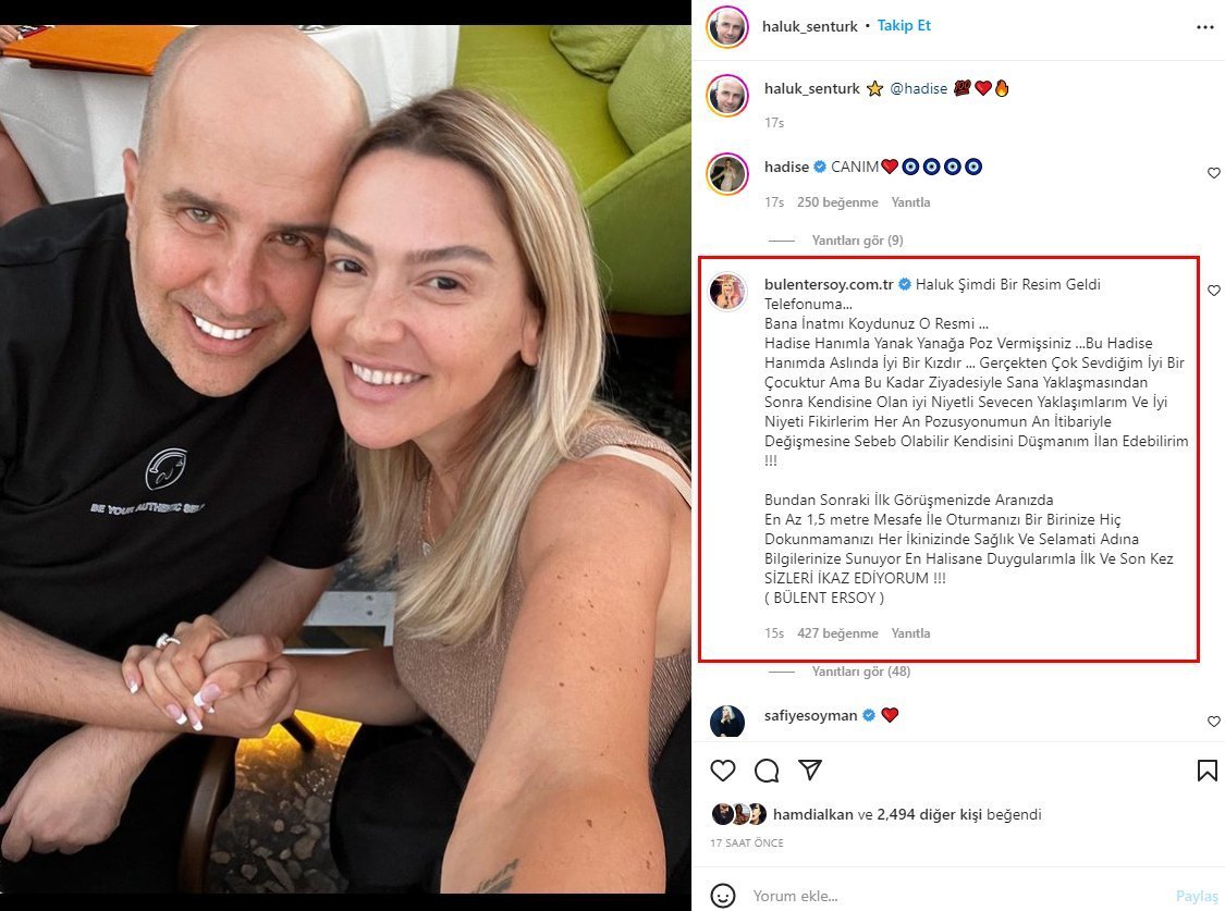 Belə ki, Bülent onların bu cür səmimi pozasını qısqanıb və menecerinin paylaşımına bu sözləri yazıb: