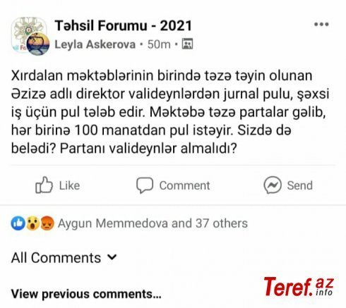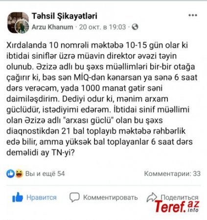 Di gəl ki, bu təyinatdan sonra həmin məktəbdən şikayətlərin ardı-arası kəsilmir. Həm valideynlər, həm də müəllimlər sosial şəbəkə paylaşımlarında məktəbdə müxtəlif adlar altında pul yığımdan gileylənirlər.
