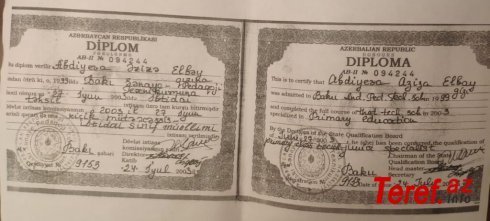 Amma məktəb direktorundan şikayətlər təkcə yığımı ilə məhdudlaşmır. Məktəb müəllimlərindən bəziləri yeni direktor Əzizə Abdiyevanın savadsızlığından da gileylənirlər. Onları narahat edən əsas məqamlardan biri budur ki, Əzizə Abdiyevanın Müəllimlər İnstitutunun Gəncə filialından olan ali təhsil diplomu saxtadır.